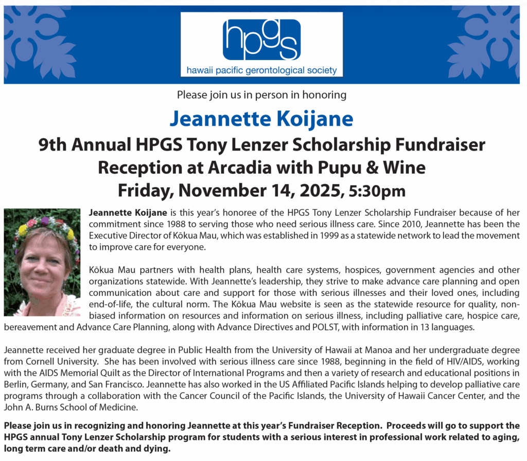 On KITV’s Kupuna Power, Brickwood Galuteria sits down with Laurie Adamshick, President of the Hawaii Pacific Gerontological Society, to discuss HPGS’s mission to enhance the well-being of older adults in Hawaii through education, networking, and age-friendly policies and programs. Watch it here:
