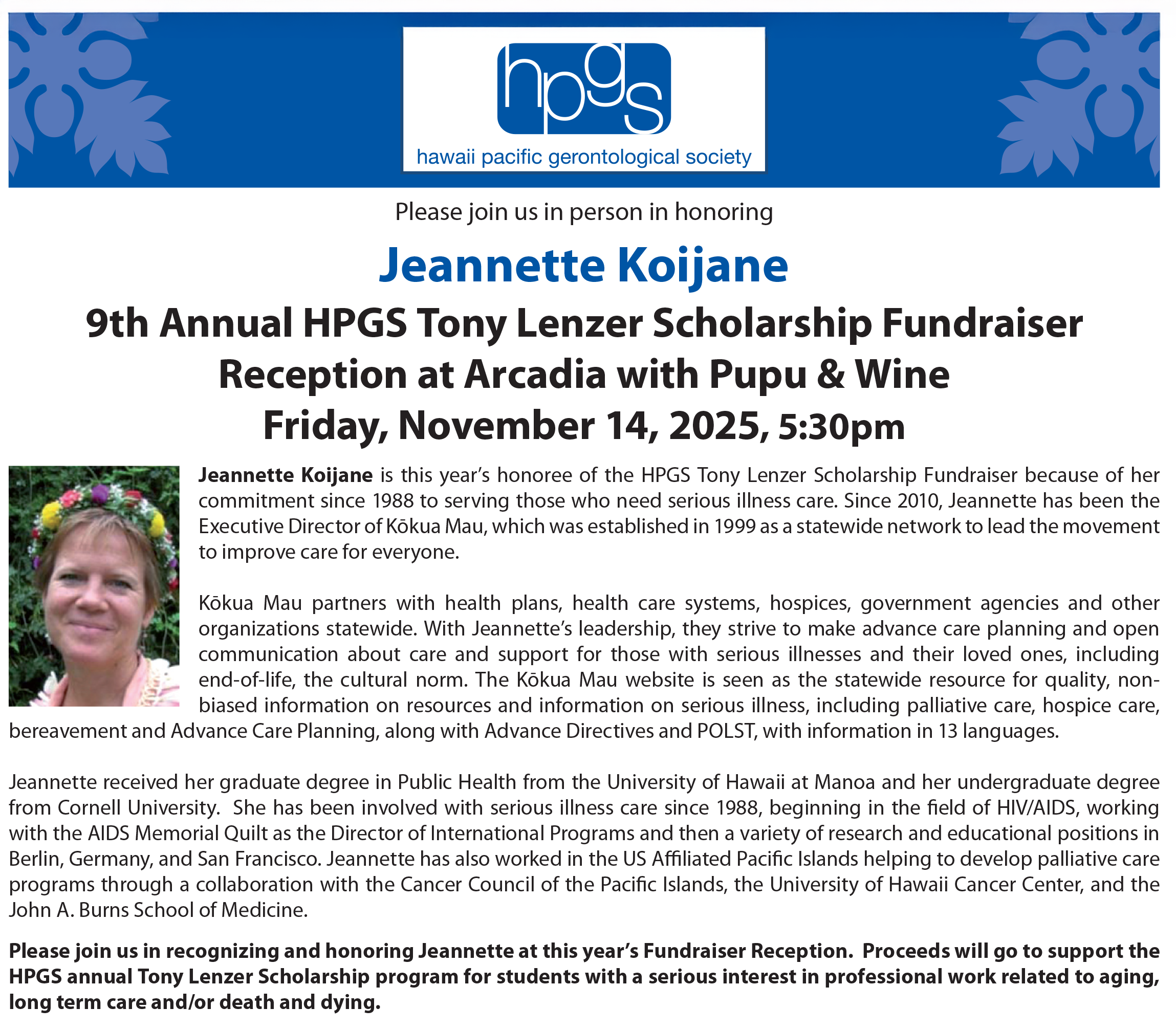 HPGS promotes an understanding of the aging process, supportive services, and legislation that helps people age with dignity and grace. It is the largest, multidisciplinary group in the State committed to discussion, networking and information sharing on issues and policies affecting older adults in Hawaii.